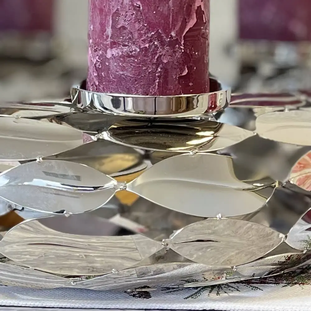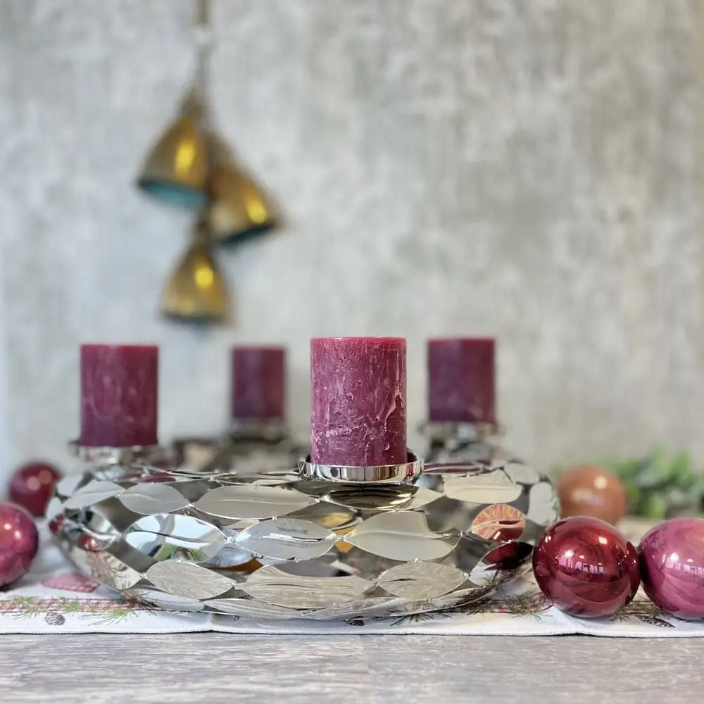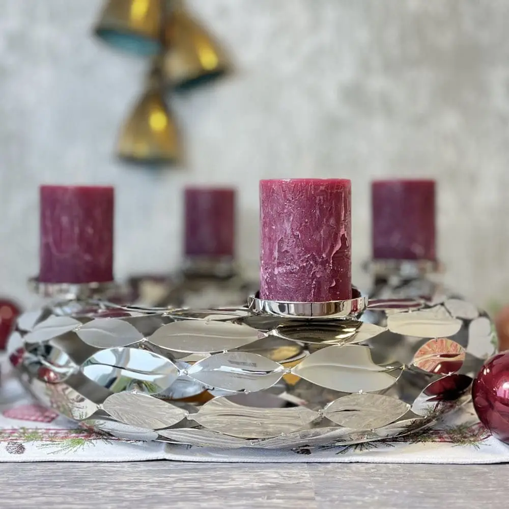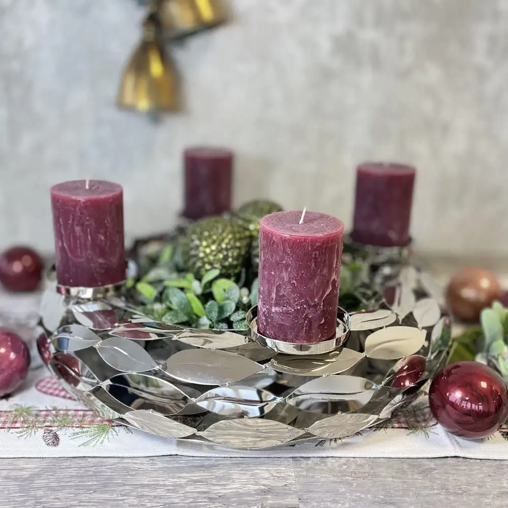 Adventskranz LEAFS Kaheku ø 49 cm – ästhetisch und besonders auffällig in hochpoliertem silbernen Farbton. Der perfekte Begleiter zur Weihnachtszeit mit passenden Stumpenkerzen aus unserem Shop. Ein extravaganter und ausgefallener Adventskranz modern, der sich wunderbar nicht nur in zeitgemäßen Einrichtungsstilen einpasst. Die besondere und edle Optik dieses Kranzes ergibt sich durch viele aneinander gereihte Blätter, die sich zu einem wunderschönen Adventskranz zusammen fügen und eine unverwechselbare Optik schaffen.