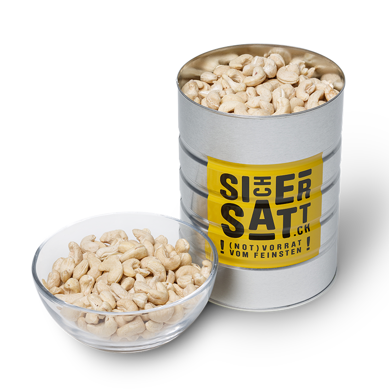 2-Liter-Dose mit 1000g feinsten Cashew-Kernen, ungesalzen.