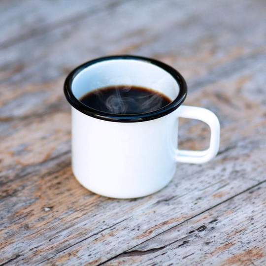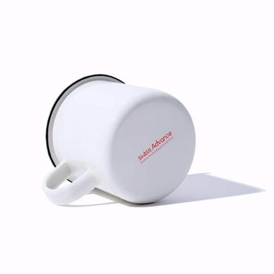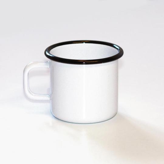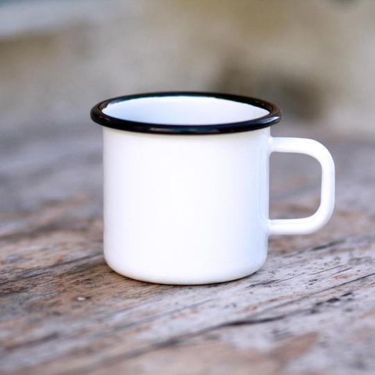 Klassische Emailletasse für Heissgetränke, in Weiss mit schwarzem Rand. Email wird aus einer Mischung von natürlichen Rohstoffen hergestellt und hat hervorragende Eigenschaften. Sie wird aus
