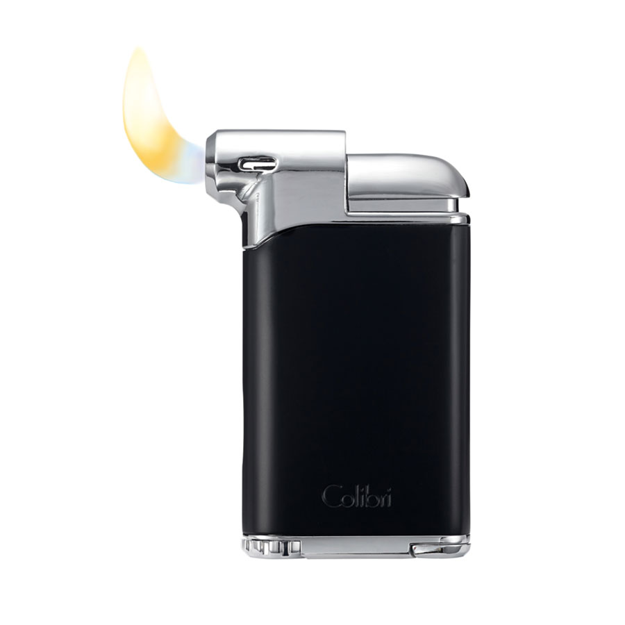 Klassisches Pfeifenfeuerzeug mit seitlich austretender Normalflamme, integriertem Pfeifenstopfer und Piezozündung.