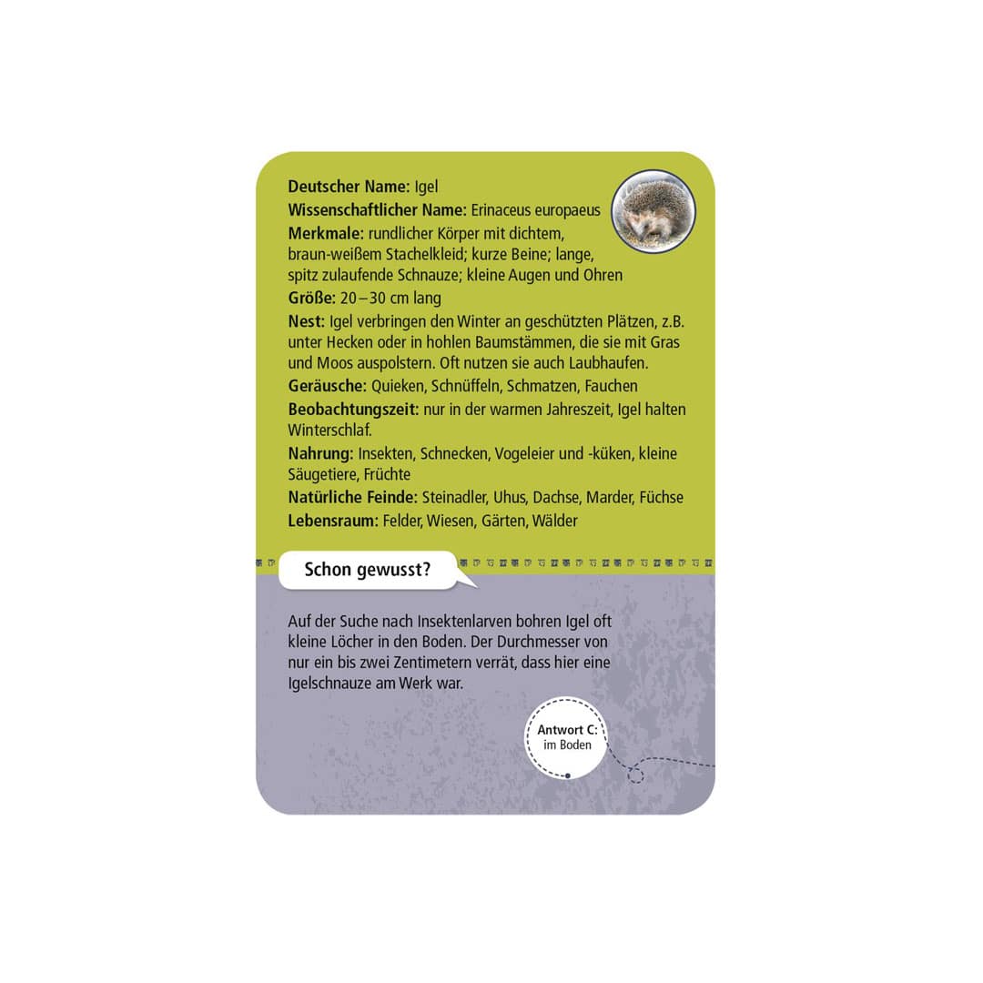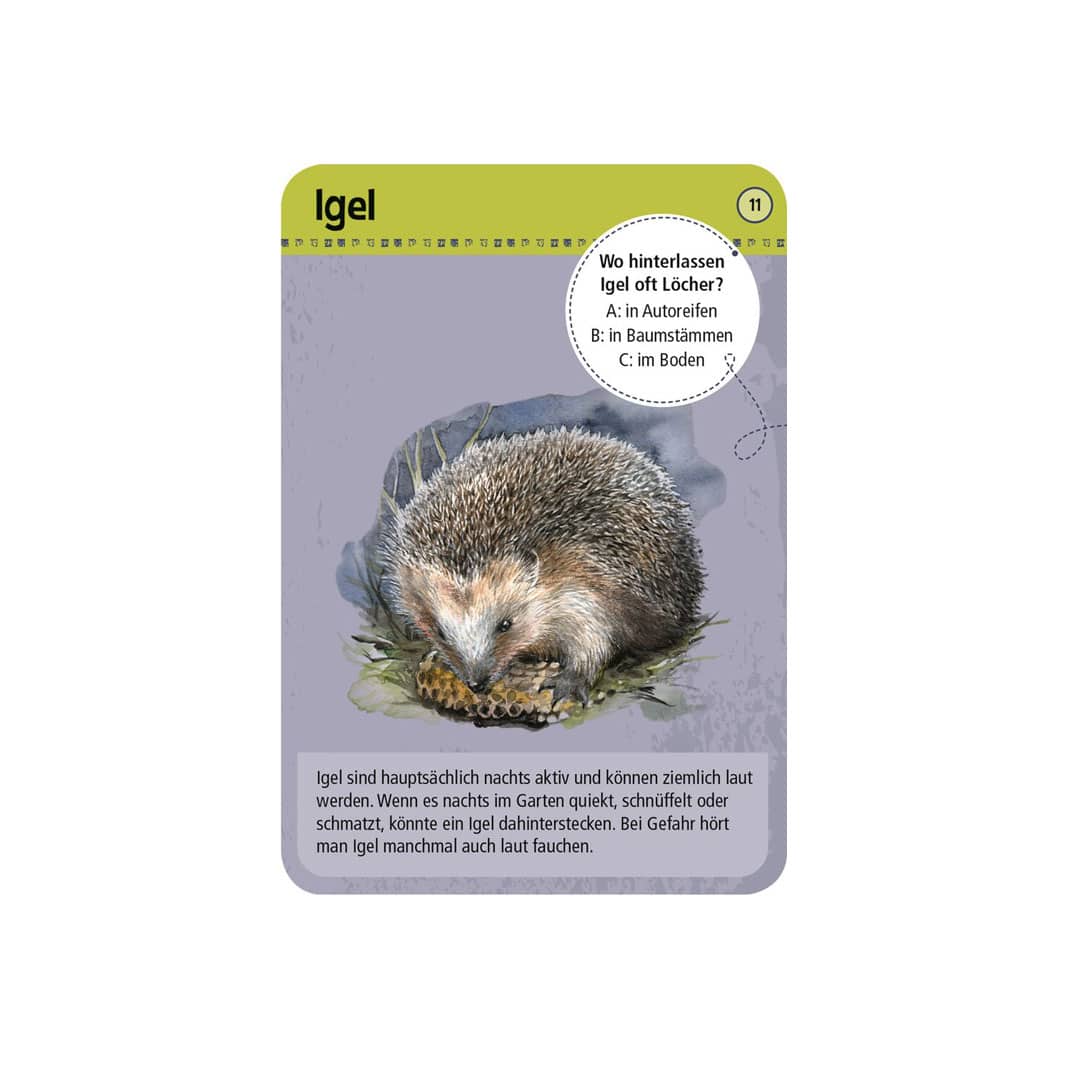 Diese Schachtel mit 50 schön gestalteten Karten und informativem Leporello bietet Informationen und Anhaltspunkte, die Tiere der Nacht wie Fuchs, Schleiereule, Feuersalamander und Co. zu erkennen und kennenzulernen. Du kannst das Kartenset auf dem abendlichen Spaziergang oder zur Nachtwanderung einstecken und du wirst einen nützlichen Begleiter dabei haben wenn du den nächtlichen Tieren begegnest!