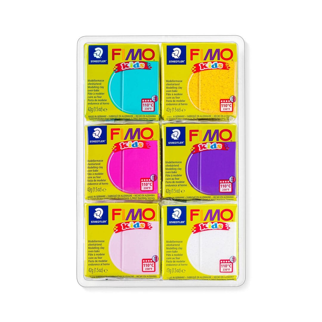 FIMO® kids Color Pack Fancy ofenhärtende Modelliermasse in 6 verschiedenen Girlie-Farben, davon 2 mit Glitzer, made in Germany.