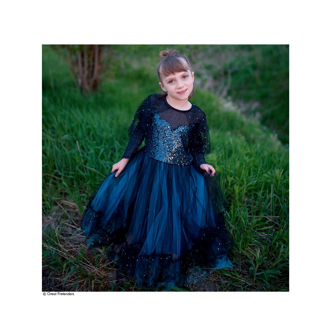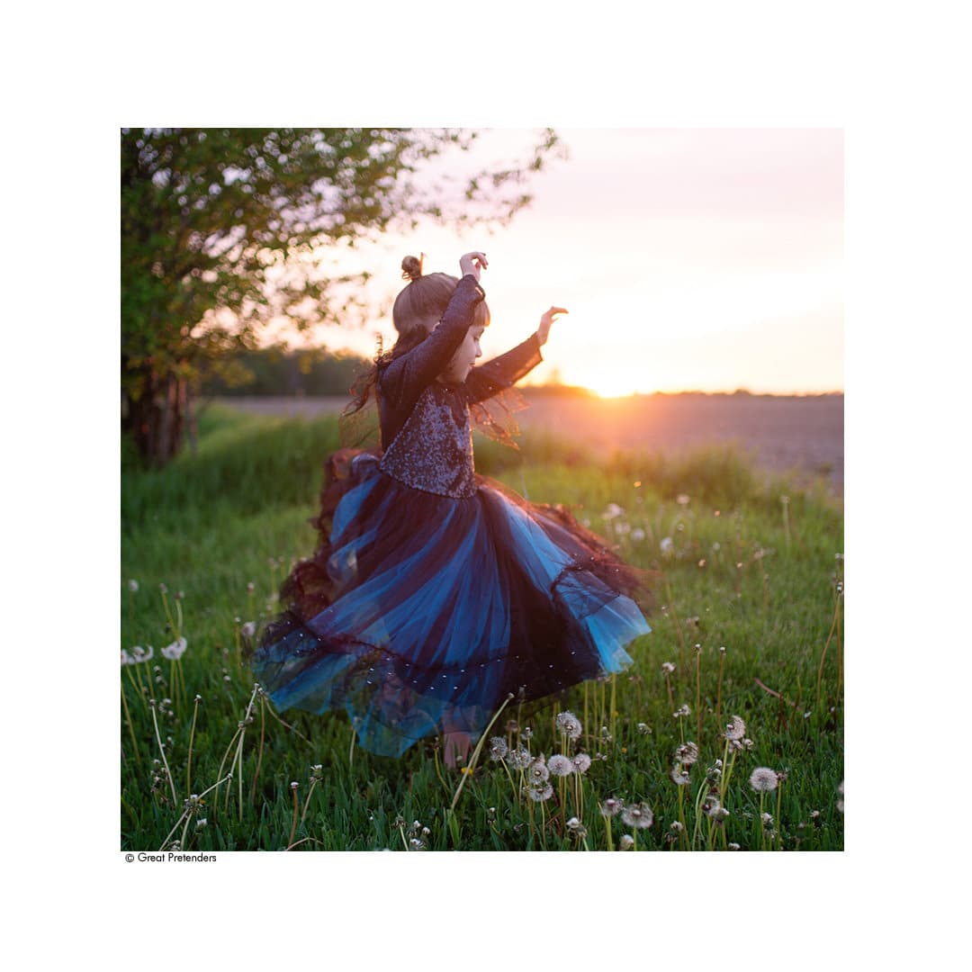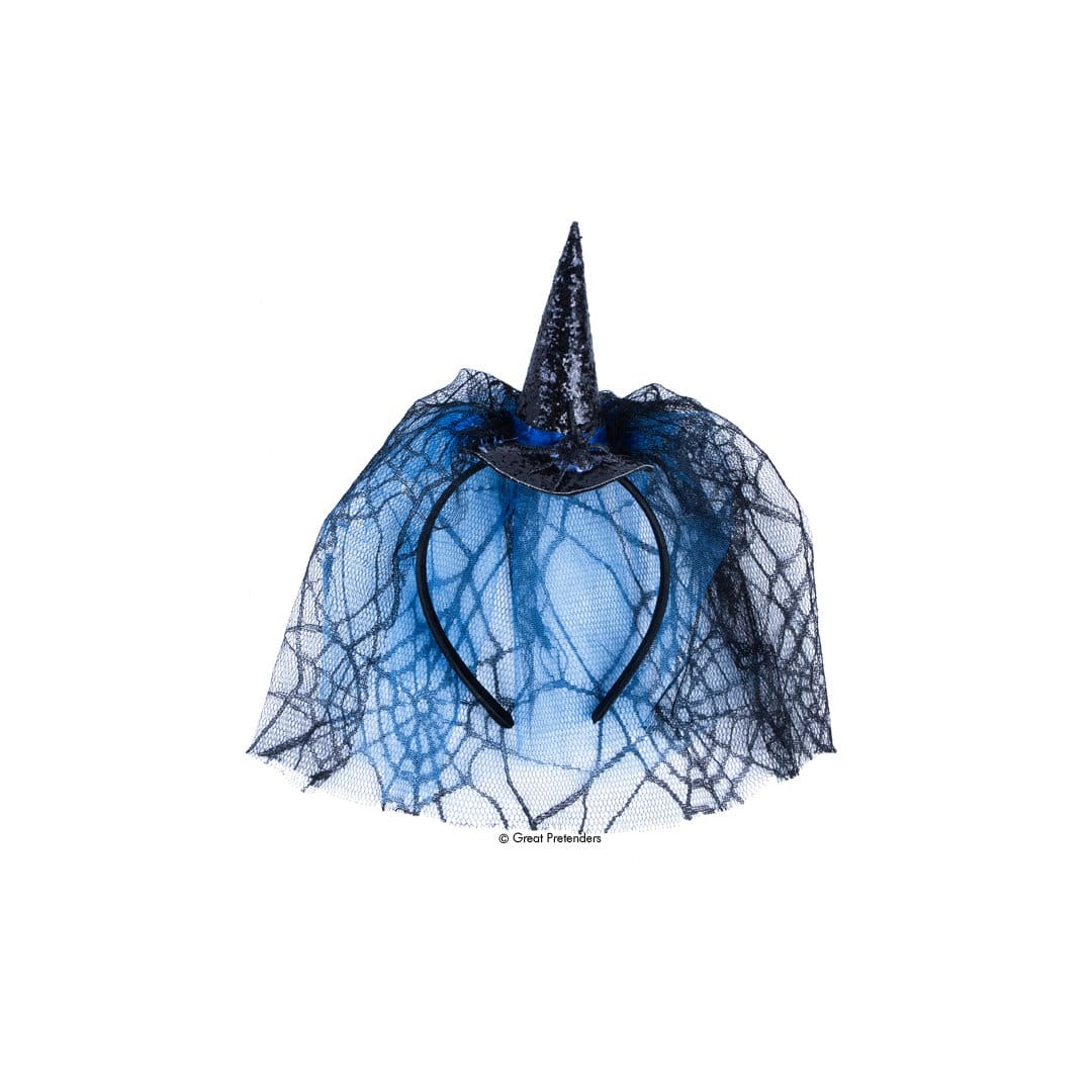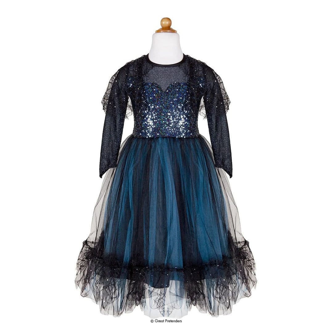 Dieses Hexenkleid ist wunderschön edel aus dunklem türkisfarbenem Tüllstoff mit schwarz schillernden Pailletten am Oberteil, die in ein schwarzes Netz übergehen. Schwarze Spinnennetz-Spitzen fallen über die Schulterteile. Der Rock des Kleides besitzt ebenfalls schwarze Spitze am unteren Rand und besitzt eine Schicht türkisfarbenen Tülls darunter. Dieses Kleid wird mit einem passenden Kopfschmuck geliefert, einem schwarzen Glitzer-Hexenhut mit Spinnenakzent mit dem gleichen schwarzen Spitzen-Spinnennetz, der auch am Kleid befestigt ist. Das Haarband besitzt ein breites Gummiband, das mit schwarzem Satin umwickelt ist.