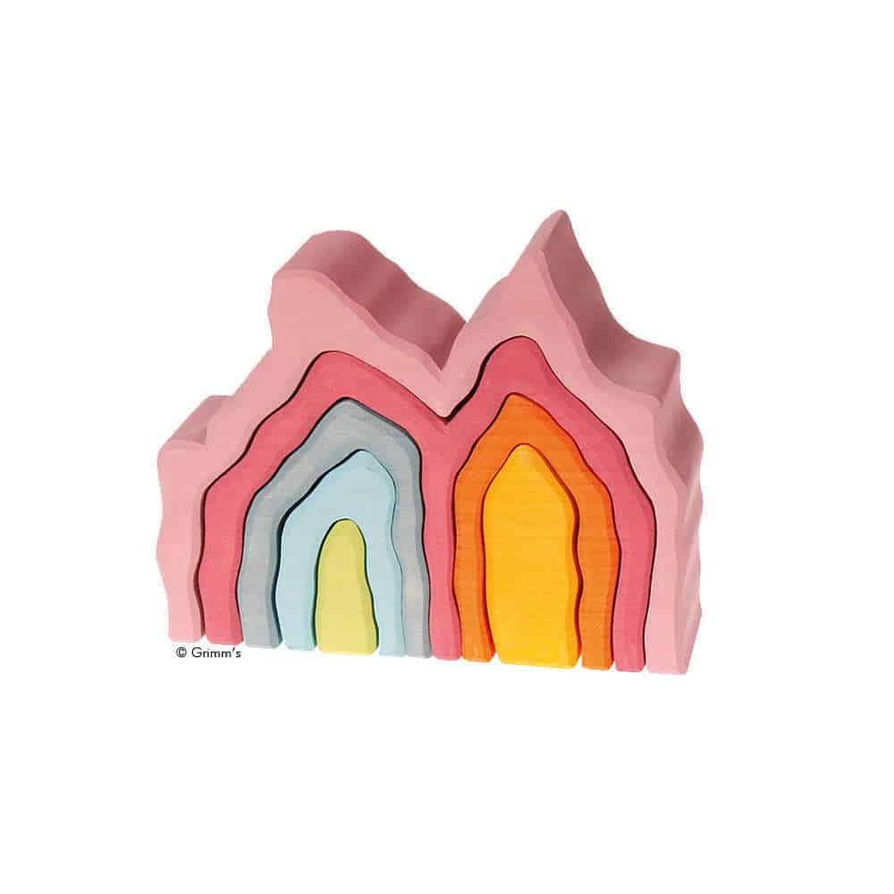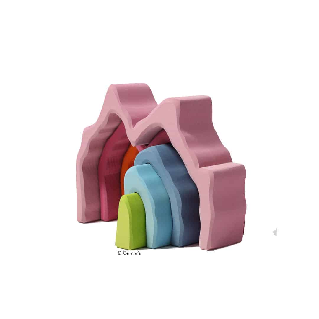 7 pastellfarbene Holzbausteine in Höhlenform, zum Stapeln, Bauen, Spielen und Türmen.