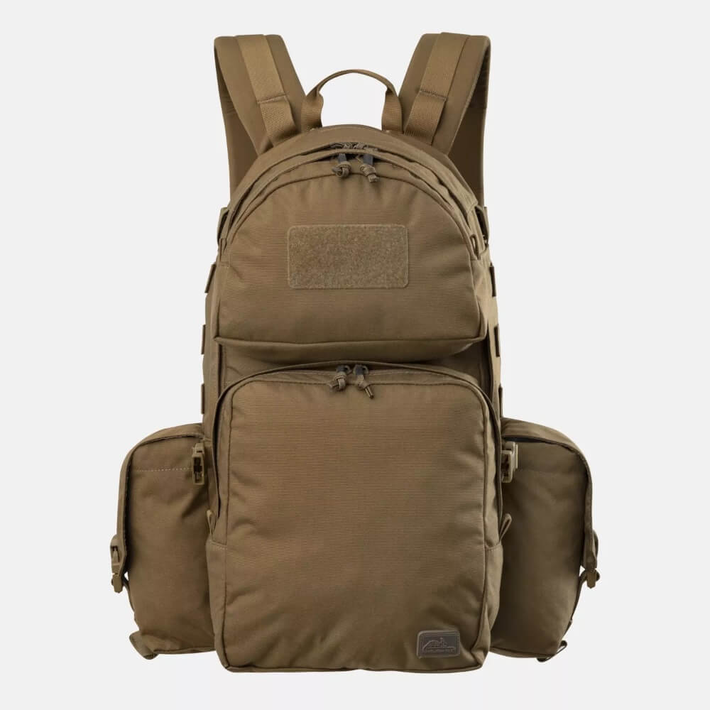 Die Vordertasche, die sich oben am Rucksack befindet, verfügt über einen externen Klettverschluss zur Personalisierung und ist innen mit weichem Velours gefüttert, um Optiken oder Nachtsichtgeräte sicher zu transportieren. In der unteren Tasche können kleinere Ausrüstungsgegenstände untergebracht werden. Der Rucksack verfügt außerdem über eine Biberschwanztasche für einen Kampfhelm, ein Tarnnetz oder zusätzliche Kleidung. Der Biberschwanz kann bei Bedarf aufgerollt und in einem flachen Fach am Boden des Rucksacks verstaut werden. Zwei Seitentaschen bieten Platz für einen Wasservorrat oder Munition. Über den Seitentaschen befinden sich Riemen, die mit dem MOLLE/PALS-System kompatibel sind und die Anbringung von Taschen für Granaten oder eine Magazintasche ermöglichen. Im Inneren des Rucksacks befindet sich ein Fach mit Platz für eine Trinkblase.
