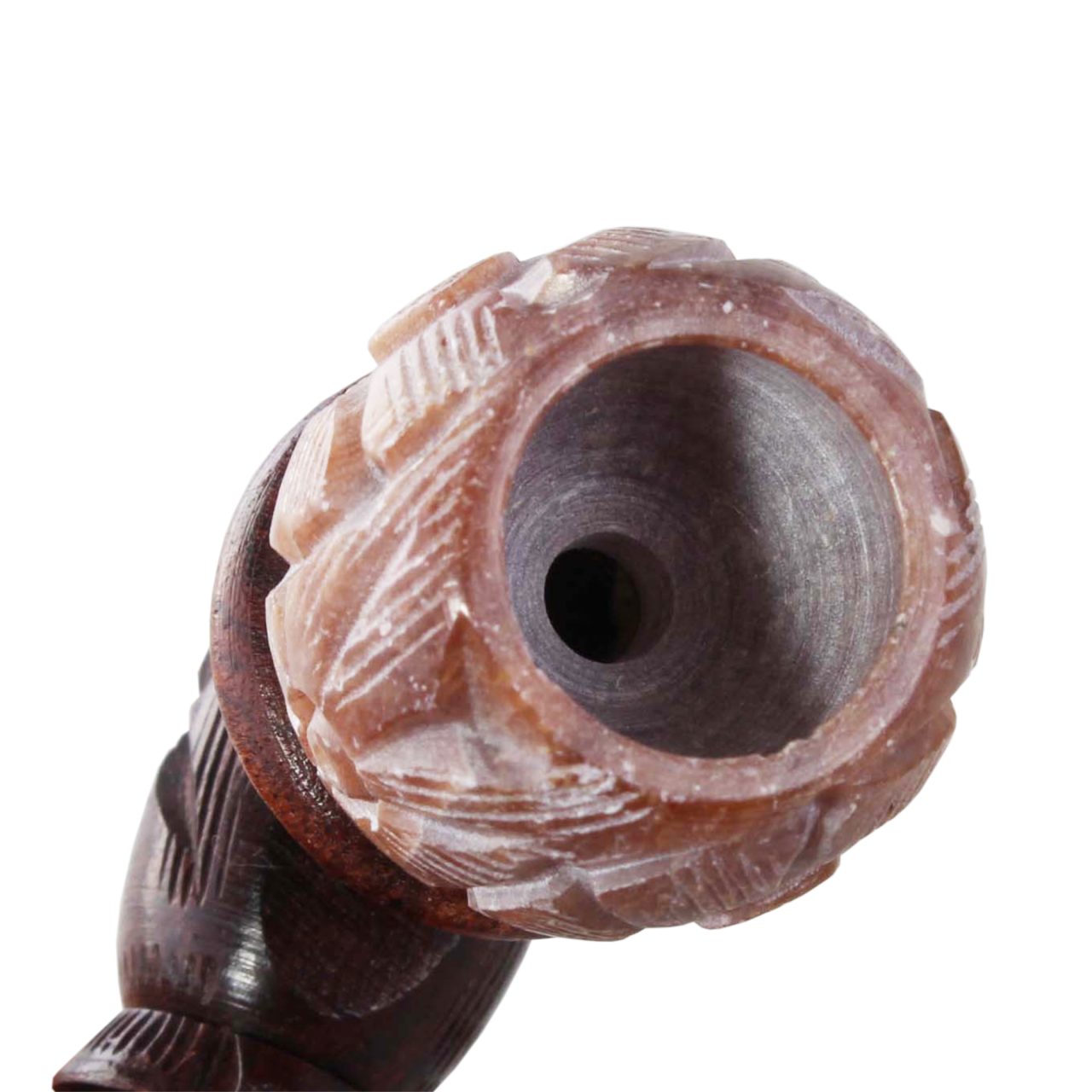 Diese Pfeife aus Holz mit einem Speckstein-Kopf vereint traditionelles Handwerk mit natürlichen Materialien für ein besonderes Raucherlebnis. Das glatte Holzmundstück liegt angenehm in der Hand, während der kunstvoll gearbeitete Speckstein-Kopf nicht nur schön aussieht, sondern auch hitzebeständig und langlebig ist.