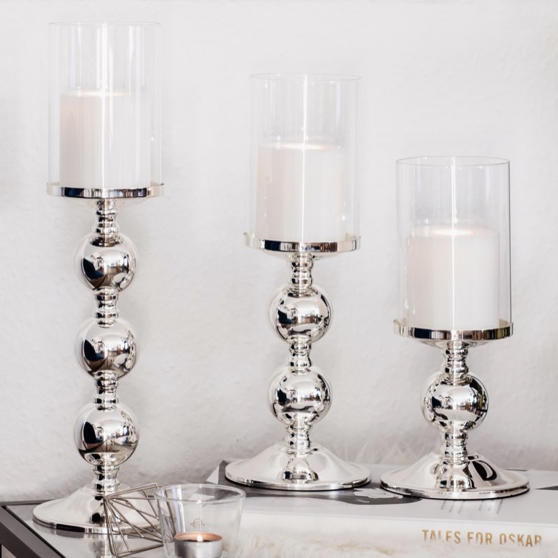Kerzenständer silber BAMBO Edzard H 27 | 34 | 44 cm – ein sehr edler und formschöner Kerzenständer. Mit diesen ausgesprochen schönen Kerzenständern können Sie Ihr zuhause königlich schmücken. So erschaffen Sie ein stimmiges Ambiente in Ihrem Heim. Der wunderschöne Kerzenständer ist hochwertig versilbert und anlaufgeschützt. Außerdem entsteht durch die Kugelform eine rund um ansehnliche Anblick. Komnieren Sie stilvoll mit den drei verschieden Größen und erschaffen Sie ein atemberaubendes Ensemble.
