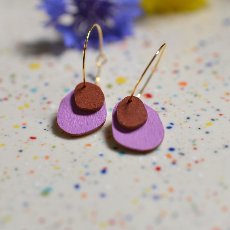 Kleine Creolen aus 24k vergoldetem Messing mit zwei Anhängern aus Birkensperrholz und Messing handbemalt.