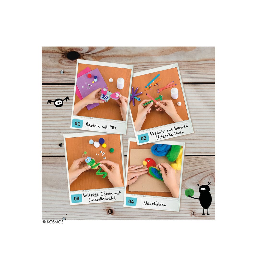 Eine Box voller Bastelmaterialien für Mädchen und Jungen mit einfachen Anleitungen für Einsteiger, geeignet für z.B. Geschwisterkinder unterschiedlicher Altersgruppen enthält das Set die verschiedensten Bastelideen mit unterschiedlichen Schwierigkeitsstufen! Es werden die Grundtechniken im Umgang mit den Materialien erklärt, so dass Kinder z.B. das Nadelfilzen oder das Arbeiten mit Filz und Chenilledraht üben können.