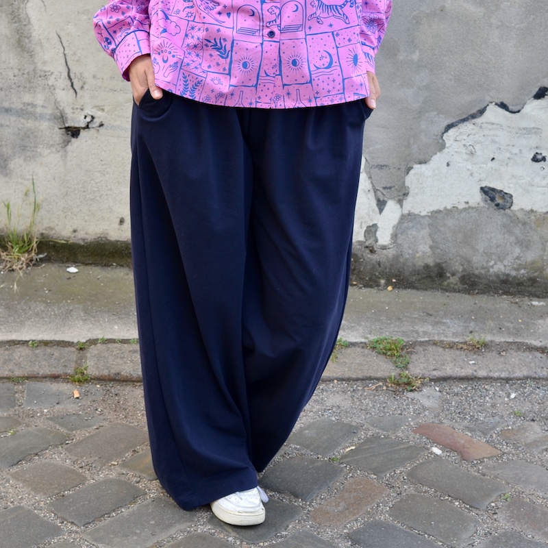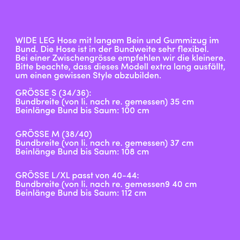 Nicki ist 175 cm, hat Konfektion 38/40 und trägt hier Größe L/XL. Größe M würde ihr ebenso passen, ist aber 4 cm kürzer. Je nach Style entscheidest Du, was Dir besser gefällt. Der Gummizug im Bund lässt viel Spielraum.