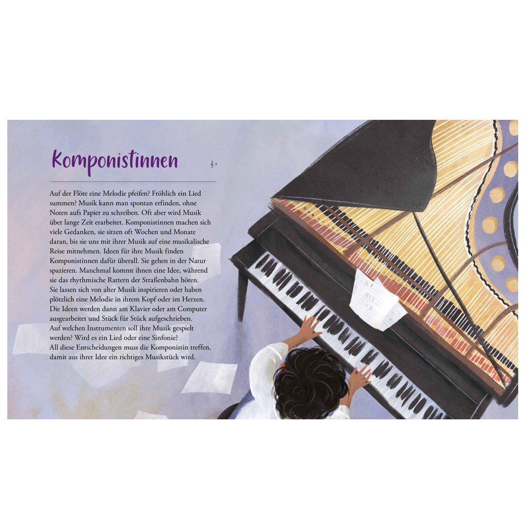 Im Buch kannst du außerdem verschiedene musikalische Berufszweige entdecken und vielleicht möchtest du selbst zu einer neuen Generation großer Musikerinnen gehören!