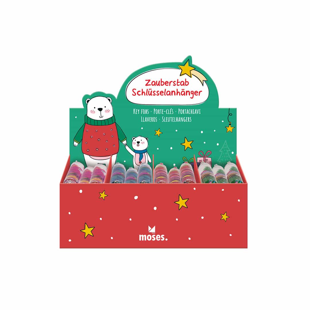 Ein zauberhafter Zauberstab mit Konfettiglitter in vier verschiedenen Farben, der sich bewegt, wenn man den Stab schüttelt. Ein hübsches Accessoire für unterwegs, am Schlüsselbund mit dem Verschluß in Form eines Sterns zu befestigen.