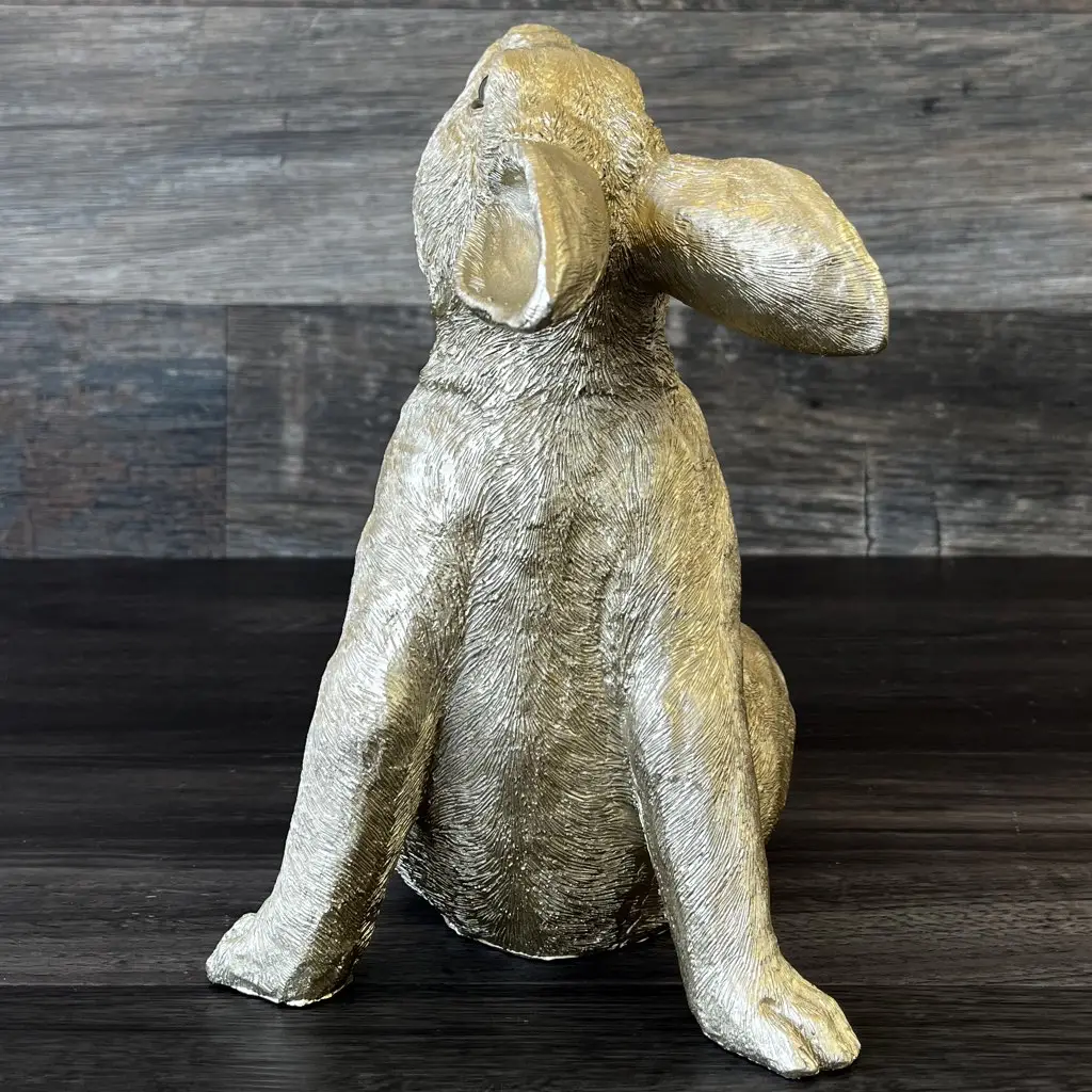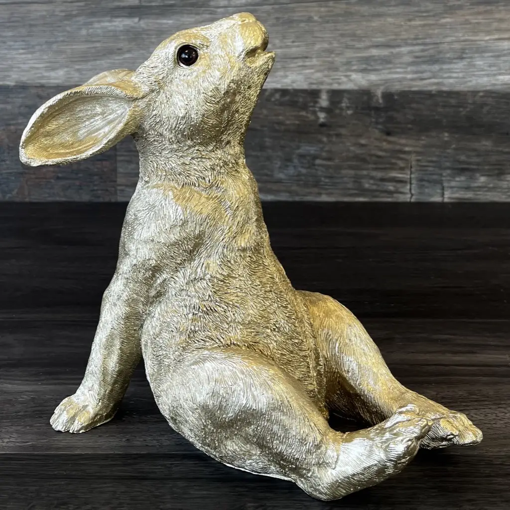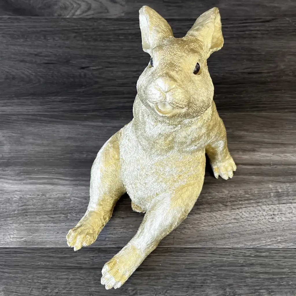 Die bezaubernde Osterhasen Deko RELAX GiftCompany gold Höhe 29 cm in entspannter Pose erstrahlt in edlem Gold, eingehüllt in detaillierte Opulenz. Die fein gearbeiteten Details verleihen der Figur einen Hauch von Raffinesse, während ihre relaxte Haltung eine Aura der Gelassenheit verbreitet. Das goldene Glanzlicht fängt das Licht ein und wirft schimmernde Reflexe, die den Raum mit einem Hauch von Luxus erfüllen.