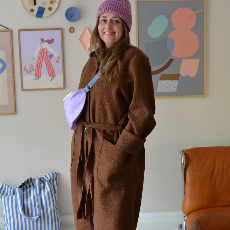 Nina, trägt Größe 42 und den Mantel in Größe 1.