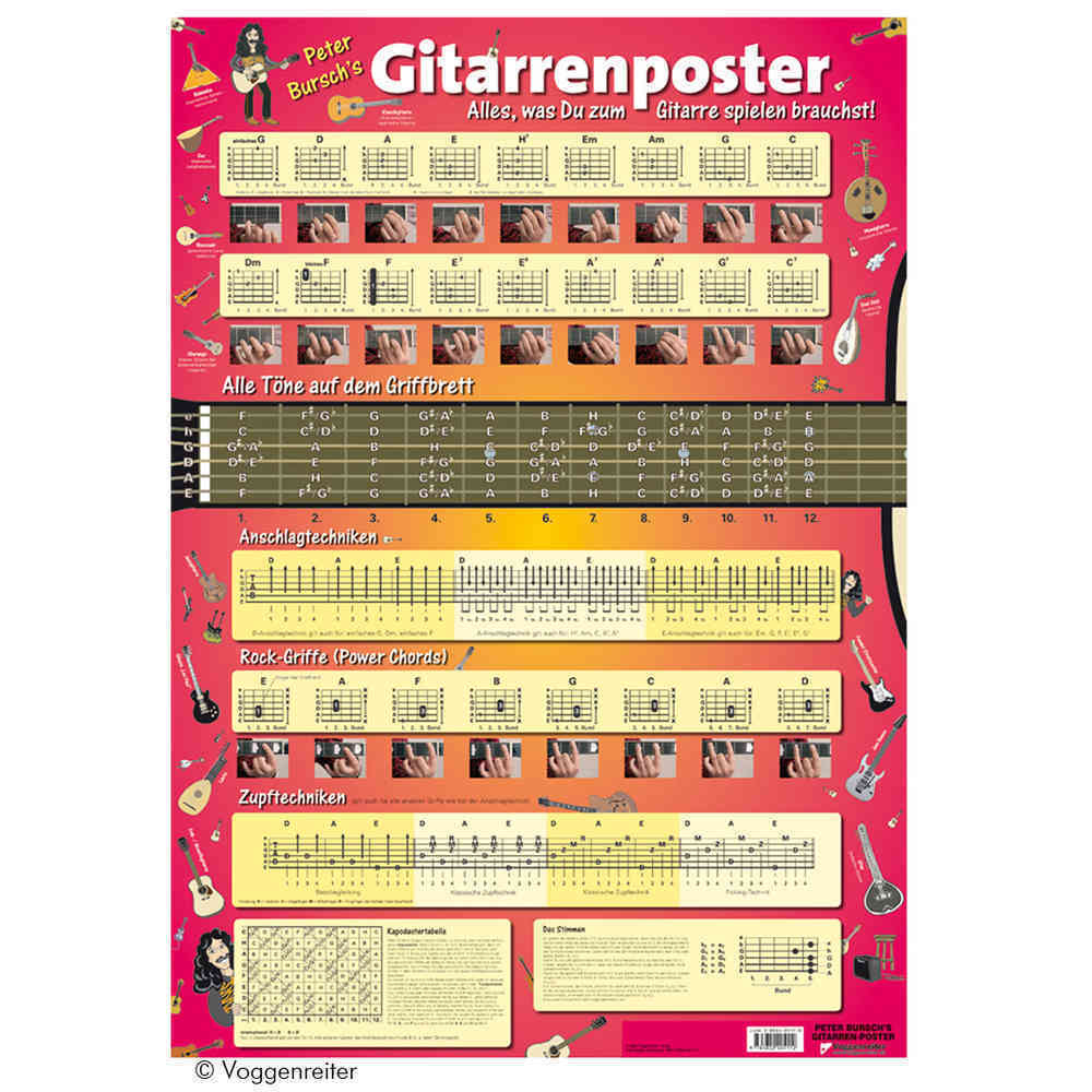 Das Gitarrenposter von Peter Bursch ist eine nützliche und übersichtliche Zusammenstellung aller wichtigen Informationen für kleine und große Gitarren-Anfänger: