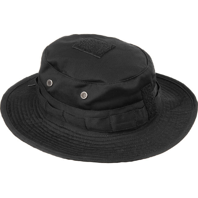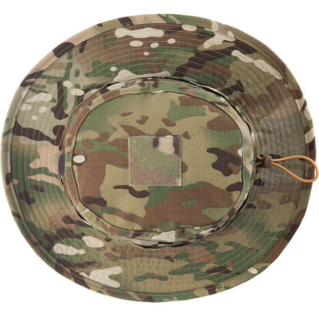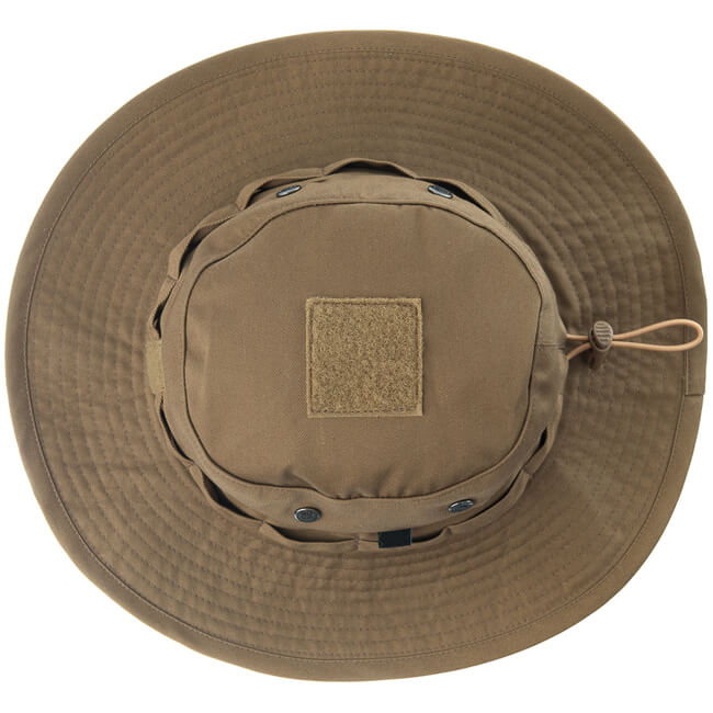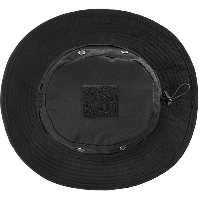 Während die klassische Form eines Boonie- Hutes beibehalten wird, ist die Oberseite etwas abfallend und misst 40 mm an der Vorderseite und 50 mm auf der Rückseite. Im oberen Bereich findet sich eine 50 x 50 mm große Klettoberfläche zum Anbringen eines IR- reflektierenden Patches. An den Seiten befinden sich Ösen für die Luftzirkulation: Klein genug um Regen abzuhalten, gross genug um eine Grundlüftung zu gewährleisten. Um den Hut herum haben wir das gleiche Material aus Polyester- Baumwolle anstelle von steifem Gurtband verwendet. Verdeckt rund um den Umfang ist eine elastische Schnur eingenäht, die eine stufenlose Anpassung der Grösse für einen perfekten Sitz ermöglicht. Die gewählte Grösse wird durch einen Stopper im hinteren Bereich beibehalten. Die Krempe ist etwas weniger breit als üblich. Genau perfekt wie wir finden. Alle anderen Funktionen der Standardmodelle, wie der Kinnriemen oder die Nackenabdeckung, wurden weggelassen. Funktionalität durch Einfachheit.