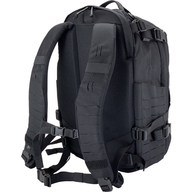 Rückseite — Die Schultergurte sind vorne mit einem kleinen Klett-Rechteck zum Anbringen eines Länder- oder ID-Patch versehen und verfügen über einen voll verstellbaren Brustgurt sowie Schnellverschlüsse zum Ablegen des Rucksacks. Lasergeschnittene MOLLE-Oberflächen bieten zusätzliche Installationsfläche für Taschen und Zubehör wie einen Kompass oder andere Gegenstände, auf die du Zugriff benötigst. Die vertikalen Schlitze können verwendet werden, um Schlaufen zum Halten von Kabeln oder eines Trinkschlauchs zu installieren.