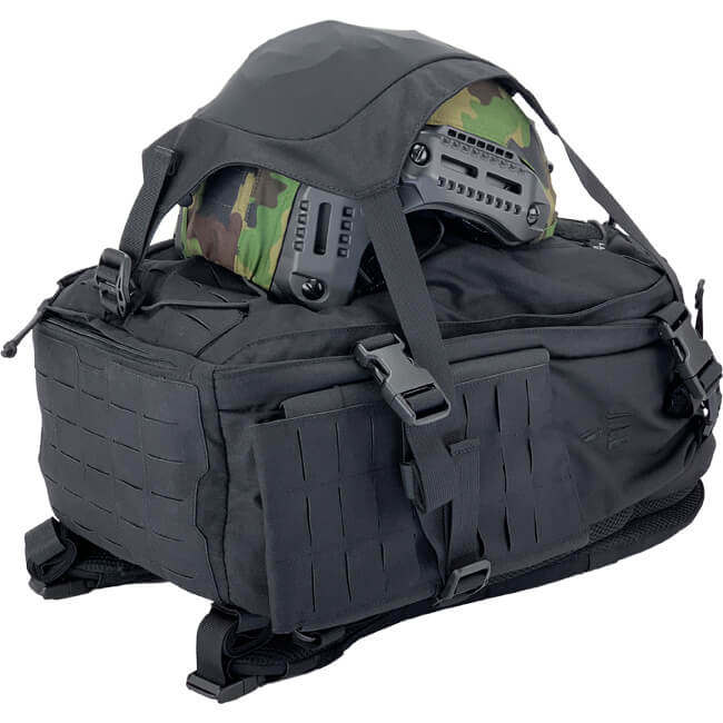 Vorderseite — Im oberen Bereich außen befindet sich eine kleine Tasche für leicht zugängliche Gegenstände wie Schlüssel, welche innen mit einem weichen Material ausgekleidet ist, um eine Brille zu schützen. Eine Helmet Hammock (im Lieferumfang enthalten) kann bei Bedarf mittels G‑Hooks vorne angebracht werden. Das elastische 4‑Wege Stretchmaterial passt sich jeder Art von Helm an, sei es dein taktischer Helm oder einfach der Fahrradhelm für deinen täglichen Weg zur Arbeit.