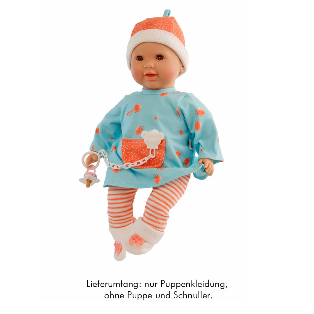 Die Puppenkleidung „Erdbeere 37cm“ passt perfekt zum „Lenchen“ und dem „Schlummerle 37cm“, den großen Babypuppen mit Schlafaugen von Schildkröt.