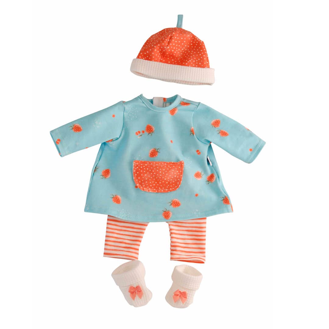 Die Kleidung besteht aus einer hellblauen Tunika mit Erdbeer-Motiv, Leggings mit Ringelmuster und einer dazu passenden Mütze, die an eine Erdbeere erinnert, sowie Söckchen mit roten Schleifen drauf.