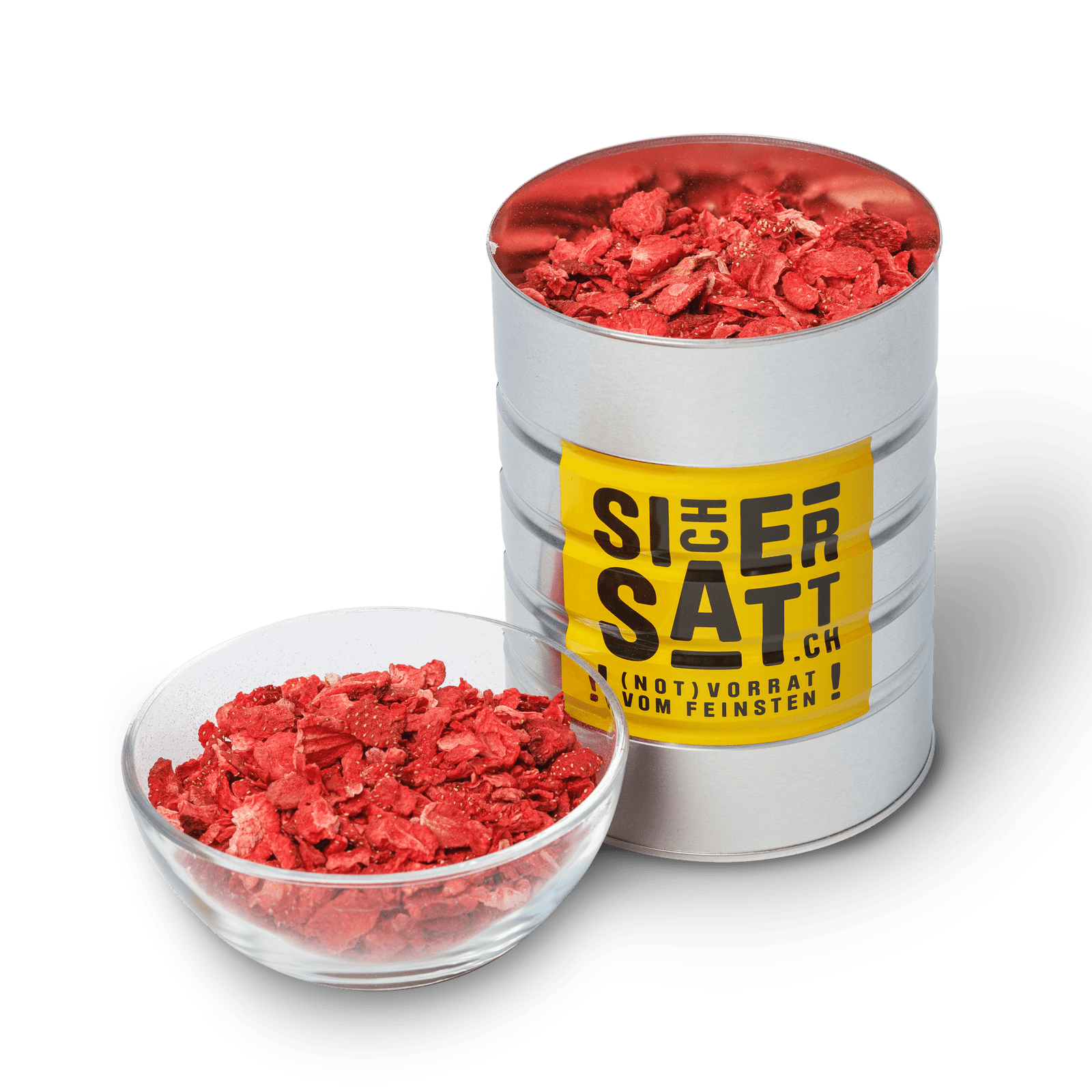 2-Liter-Dose mit 350g Erdbeeren, gefriergetrocknet (Bruch und Pulver/ Frischeverhältnis 1:10).