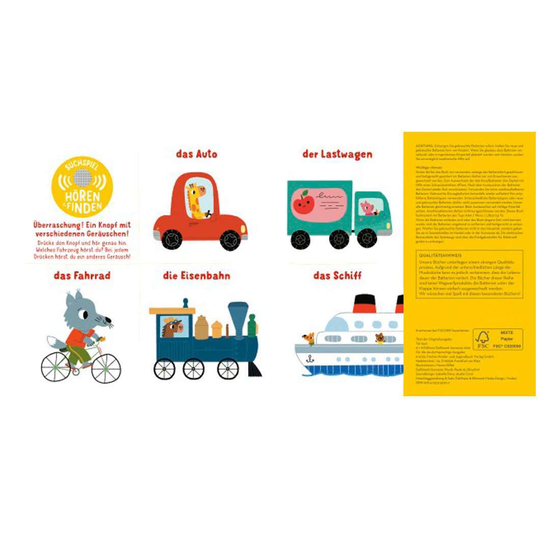 - Mit Such- und Ratespiel am Ende des Buches: Auf der letzten Buchseite kann zufallsgeneriert das Geräusch eines Fahrzeugs abgespielt werden, den die Kinder dann selbst dem passenden Fahrzeug zuordnen müssen.