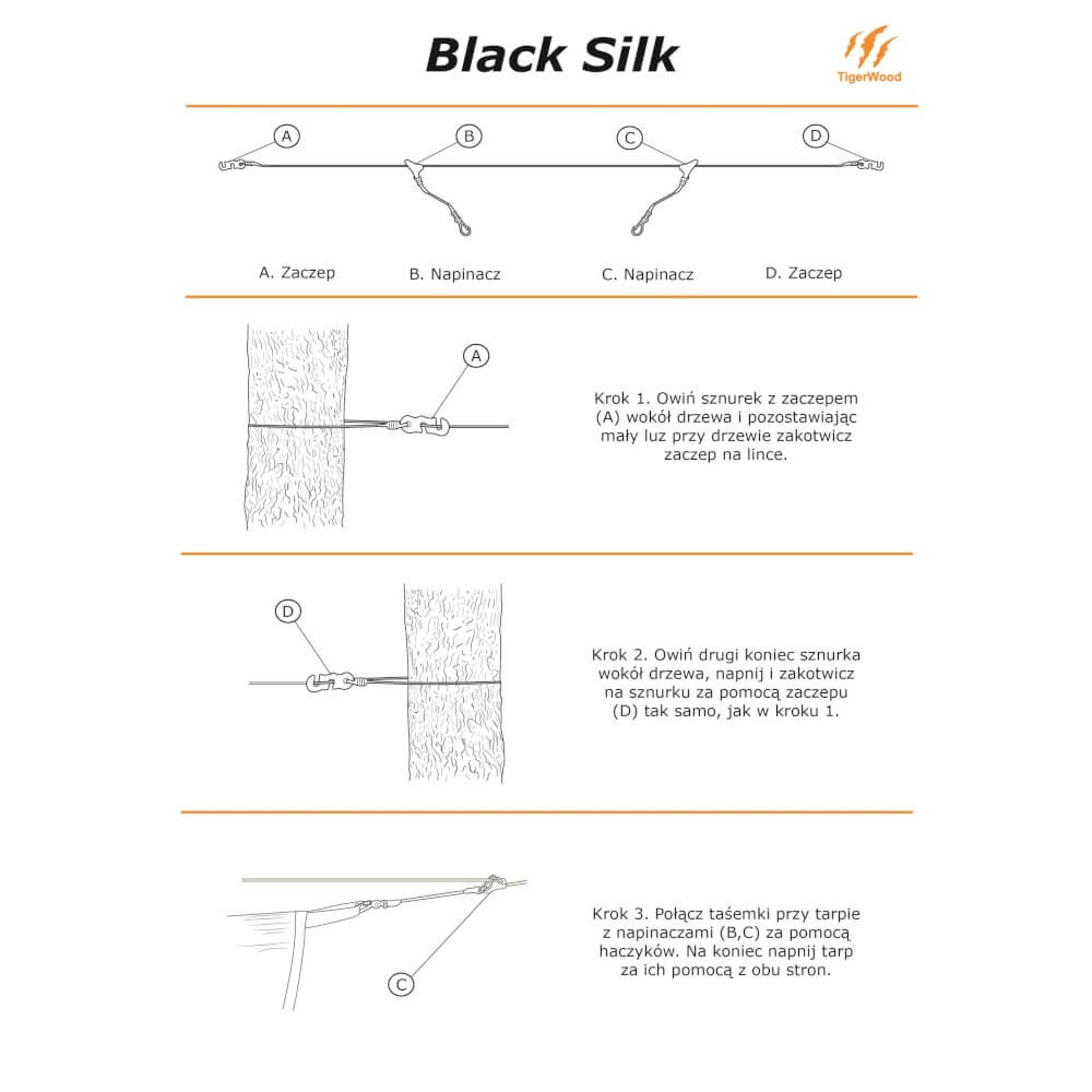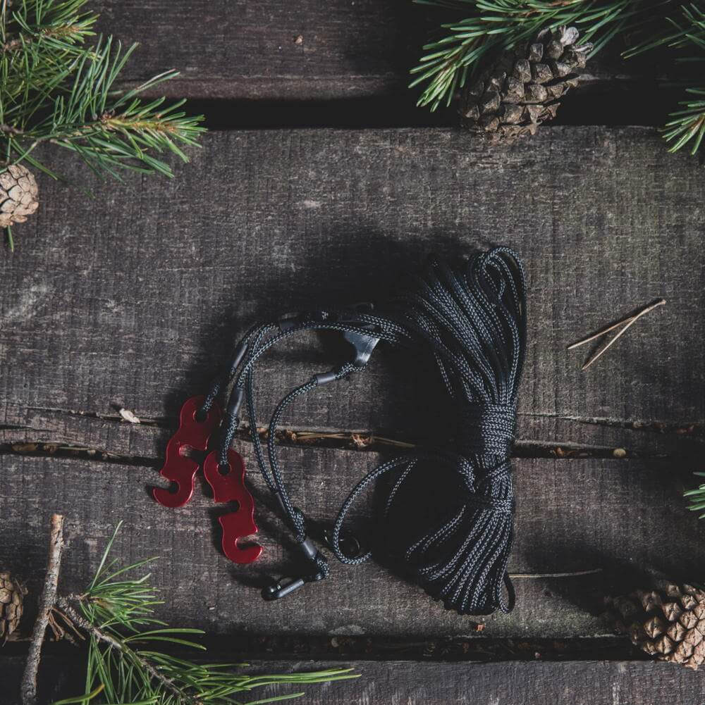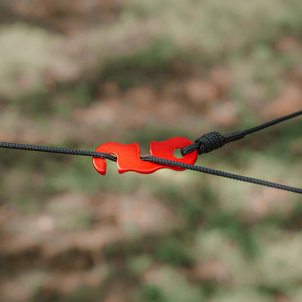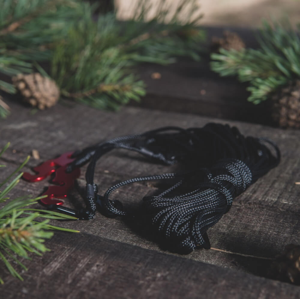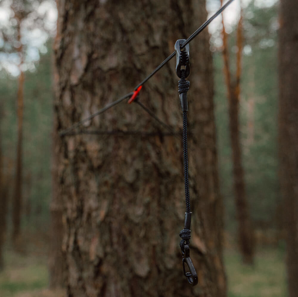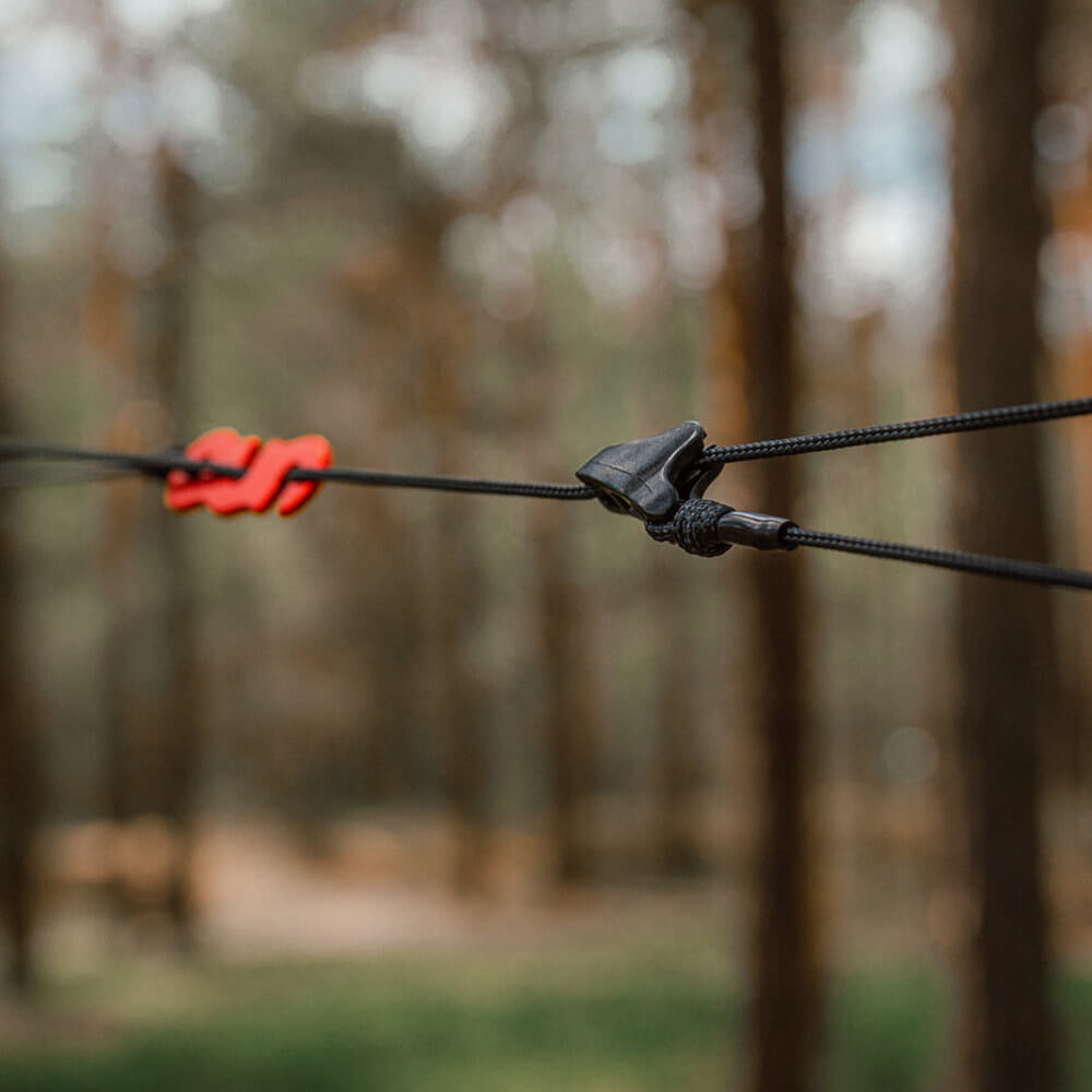 Dies ist ein sehr einfaches, knotenloses Schlingenmodell, das das Aufhängen unserer TigerWood Tarps beschleunigt. Und wie wir alle sehr gut wissen, ist bei unsicherem Wetter jede Sekunde Gold wert. 10 Meter Zurrschnur sind völlig ausreichend, auch bei größerem Abstand zwischen den Bäumen. Nach dem Befestigen der Laschen an der Hauptspannleine haben wir eine dauerhaft straffe Plane.