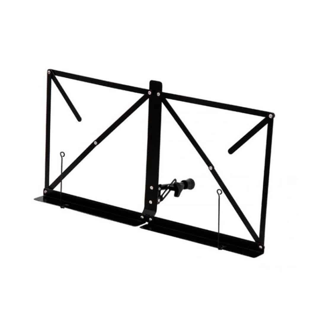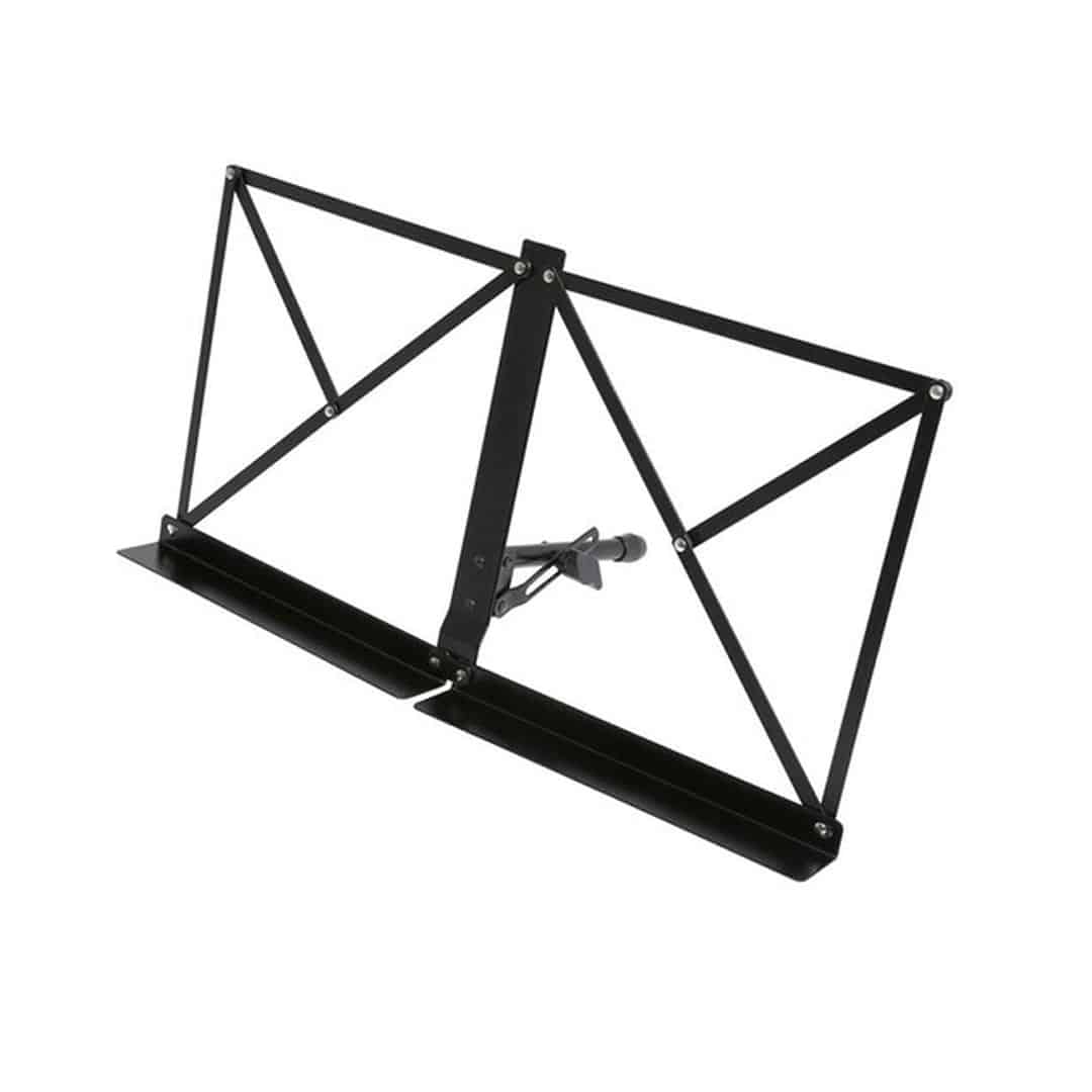 Der Notenständer ist ausklappbar und steht sicher auf jedem Tisch oder anderem Pult. Besonders praktisch sind die verstellbaren Fixierarme für Notenblätter oder Bücher, die so festgehalten nicht herunterfallen oder herunterklappen können.
