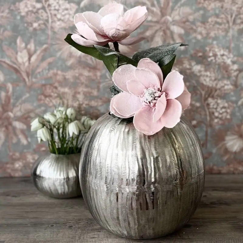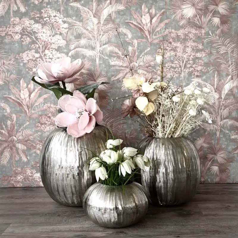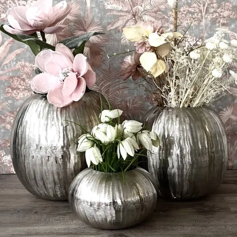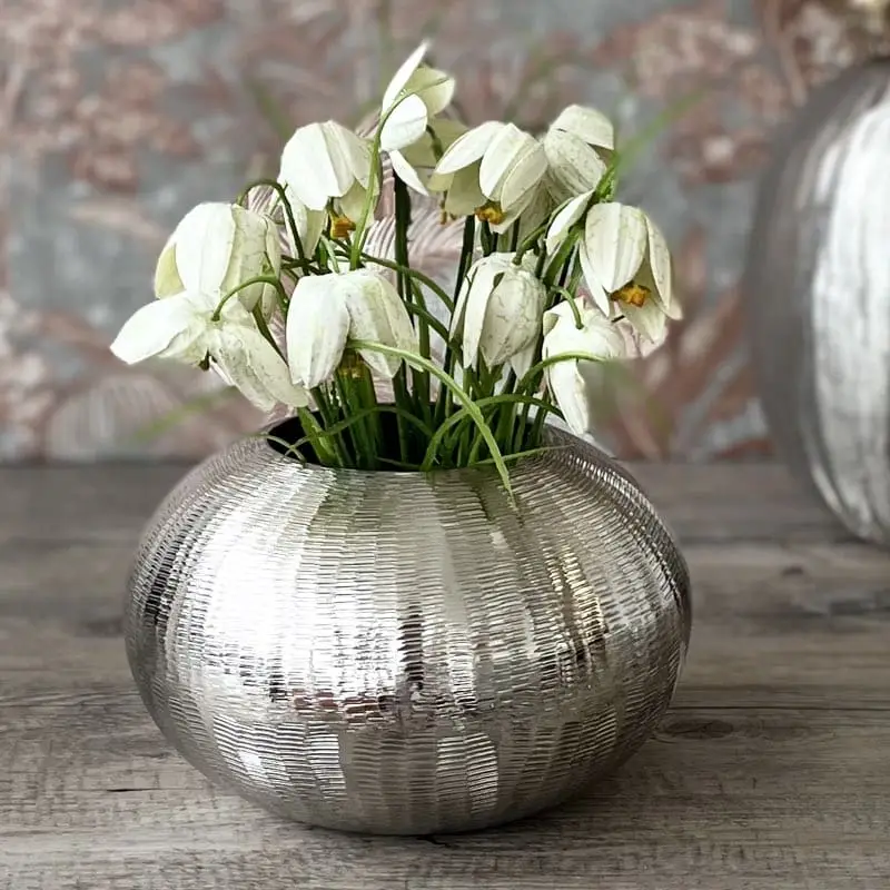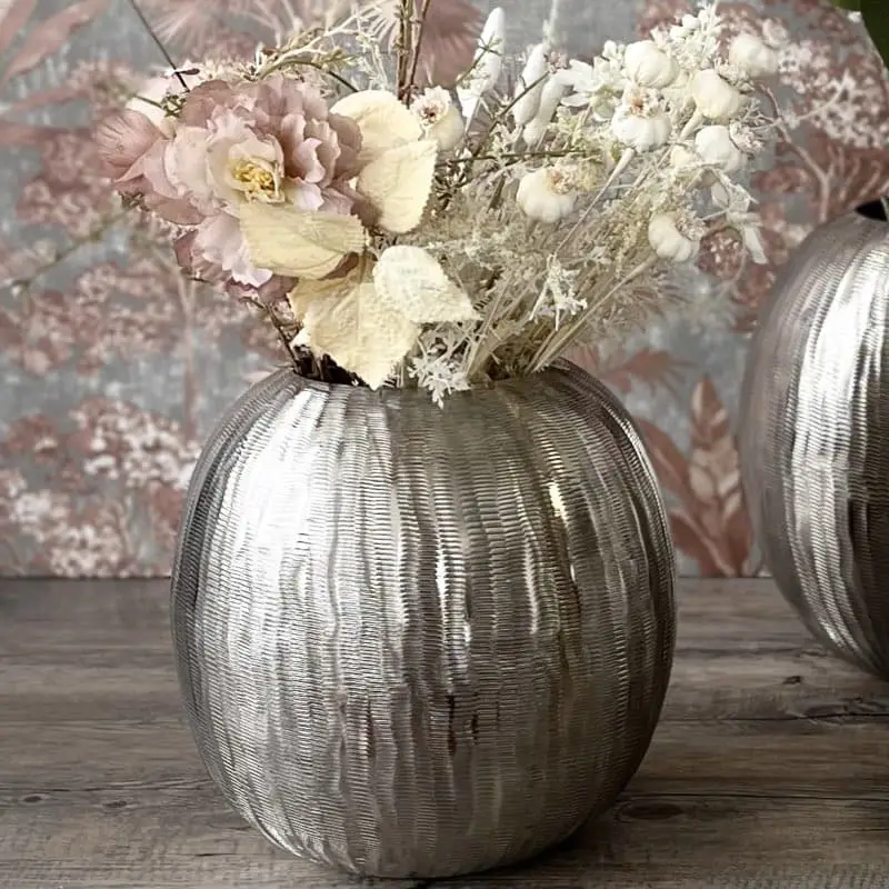 Die Vase silber CORBARA Kaheku H 28 | 25 | 13 cm kommt mit einem ausgesprochen edlem Anblick daher. So erzeugt die hochglänzende und geschliffene Oberfläche einen einmaliges Ambiente in Ihrem Heim. Dabei ist sie mit ihrer bauchigen Formgebung und den unterschiedlichen Größen individuell einsetzbar und erzeugt sowohl einzeln als auch in der Gruppe ein besonders edlen Flair in Ihren Heim. Kombinieren Sie die Vase silber CORBARA Kaheku H 28 | 25 | 13 cm aber auch stilvoll mit den Windlichtern, Lampen und anderen Vasen der Serie Corbara für ein stimmiges Wohnkonzept.