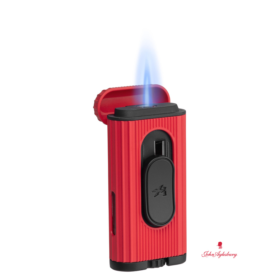 Hochwertiges und langlebiges Feuerzeug mit einer Single Jetflamme, die von einer weichen Flamme umgeben ist, einem Flip-Top und einem leicht herunterziehbaren Zündknopf.